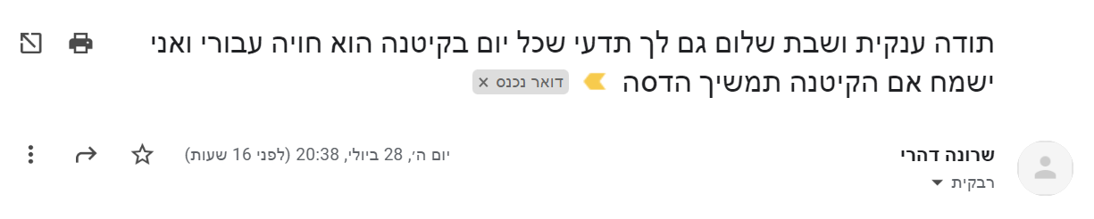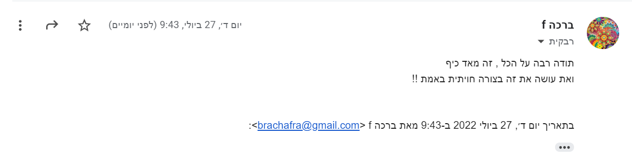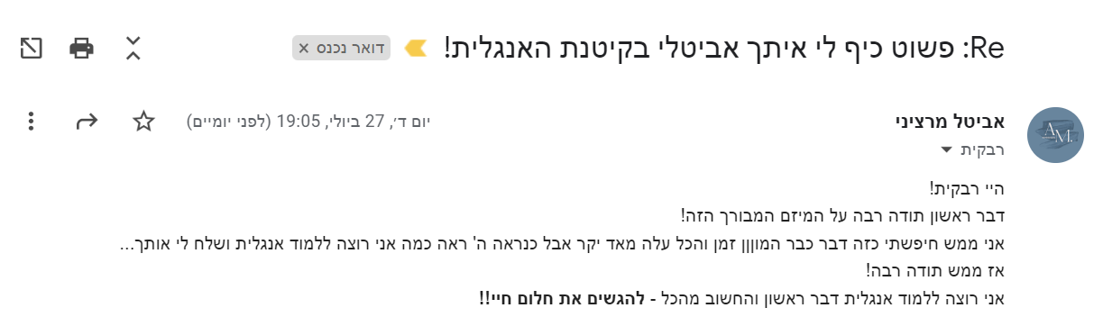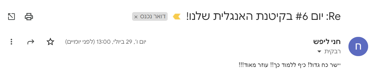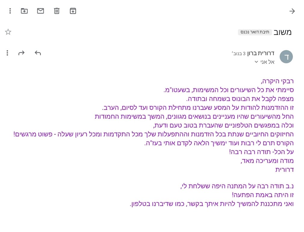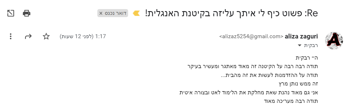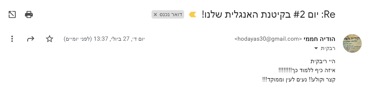בזמן הקיטנה תקבלי אפשרות לשאול שאלות במייל ולקבל הכוונה כדי לעזור לך בתהליך הלמידה!
