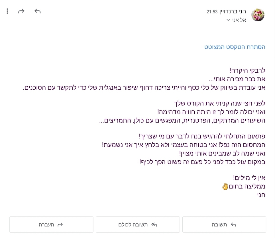 בשנים האחרונות הצלחתי להפוך מאות (עברנו את ה-1000 ליתר דיוק) נשים ובנות מ:אוהבות השפה - לכאלה שמצליחות לתקשר ולנהל שיחות שלמות באנגלית, בביטחון ובעוצמה!